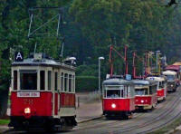 Straßenbahnen Tw 78 Bovera, Tw 117 6MT, Tw 17 T2R und T3 8106. Der historische Beiwagen Bw 44, der kurz vor der Fertigstellung ist, war noch nicht mit auf der Strecke. |