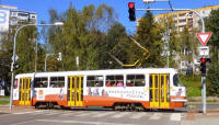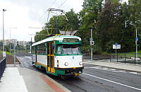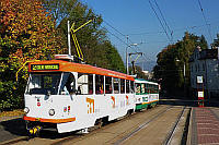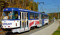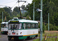 auf den Linien 5 und 11 die beliebten Triebwagen Tw 18+19 (T2R) im normalen Linienbetrieb nach Vratislavice