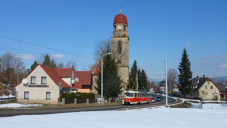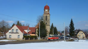 Bild 08: Tw 8106 fährt an der Kirche Hanychov (kostel) vorbei im März 2013.