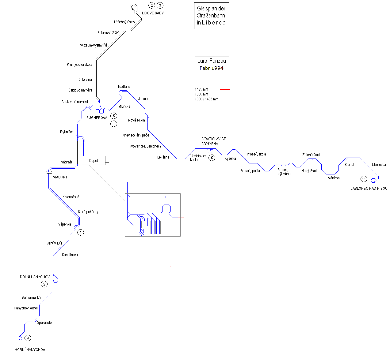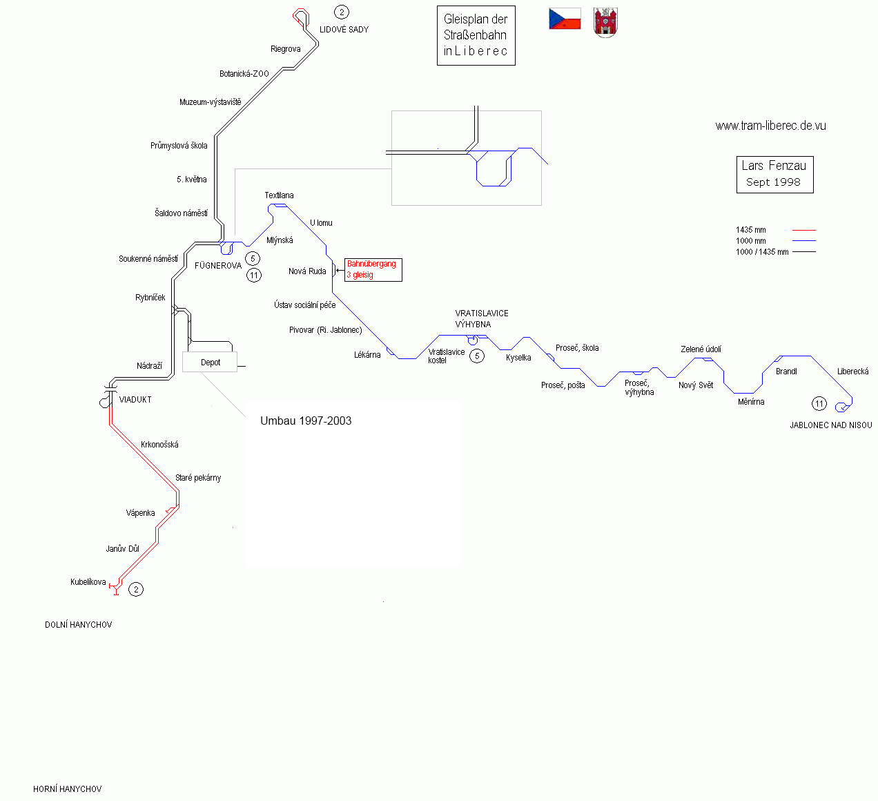 Gleisplan 1998 (Eröffnung der Linie 2 nach Kubelíkova auf Normalspur)