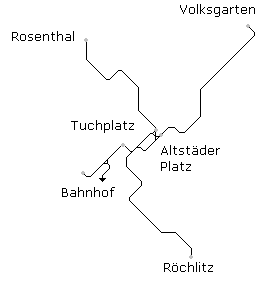 Graz her. Die erste Strecke führte vom Bahnhof über den Altstädtischen Platz zum heutigen Zoo und wurde später bis zum Volksgarten verlängert. Die Straßen der Innenstadt waren sehr eng, so dass zwei eingleisige Strecken durch das Stadtzentrum errichtet wurden.