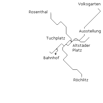 Linie 2 Rosenthal - Altstädter Platz - Tuchplatz- Röchlitz (4,2 km) Ausstellungslinie Altstädter Platz - Ausstellung (1 km)