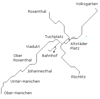 Linie 1 Bahnhof - Tuchplatz - Altstädter Platz - Volksgarten (3,3 km) Linie 2 Rosenthal - Altstädter Platz - Tuchplatz- Röchlitz (4,2 km) Linie 3 Tuchplatz - Viadukt - Ober Rosenthal - Johannesthal - Nieder Hanichen - Ober Hanichen (5,7 km)