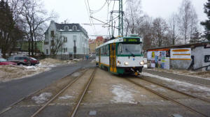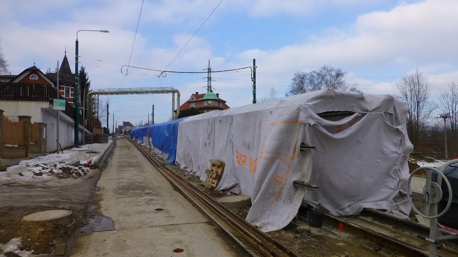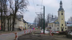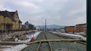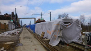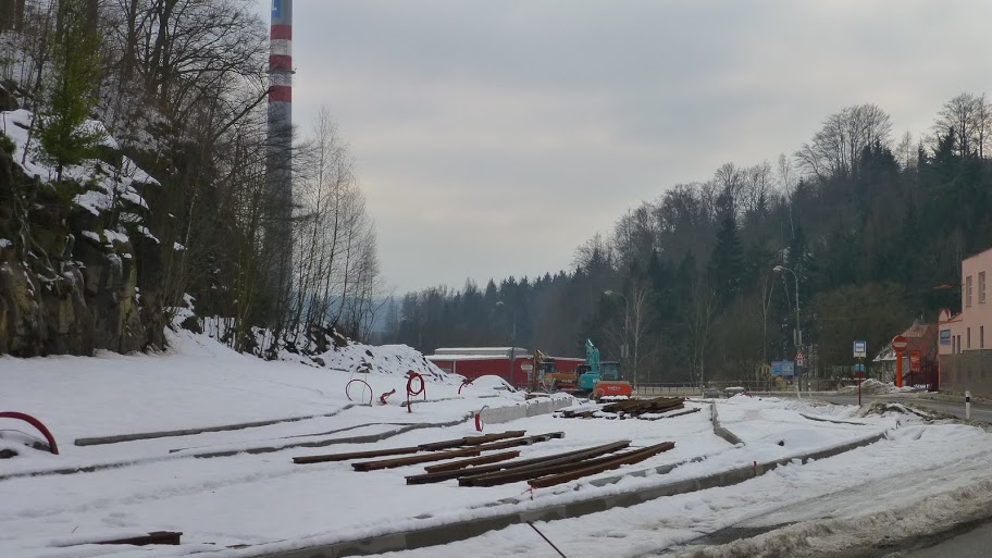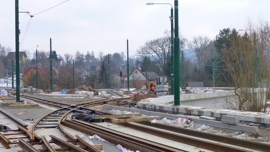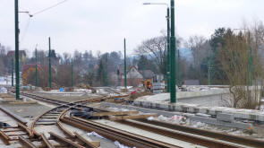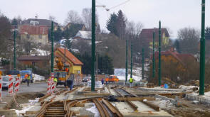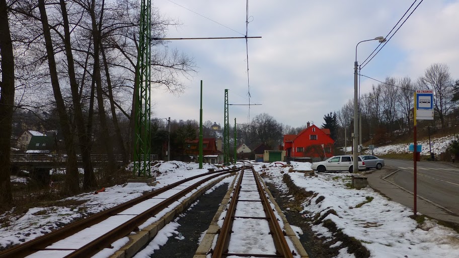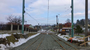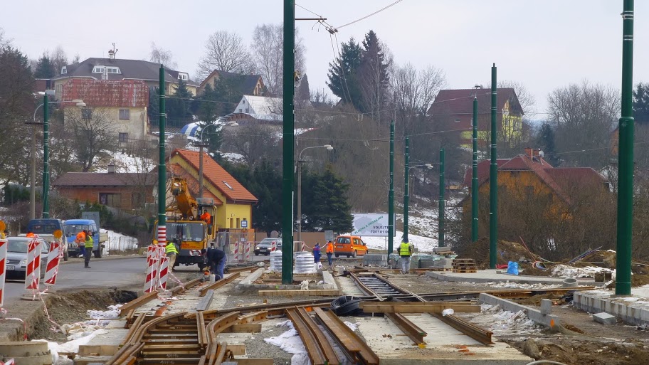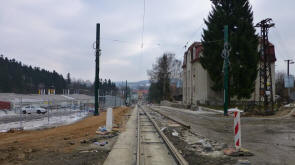 Bild 39: Im Februar 2015 sind Gleise und Oberleitung an der Hst. Vratislavice kostel fast fertiggestellt.