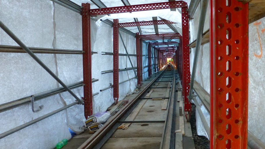 ersten Gleise verlegt und die Arbeiten an der Stützmauer